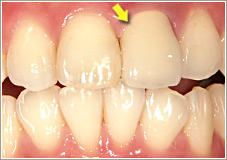 矢印の指す変色した歯にセラッミククラウンをかぶせました。